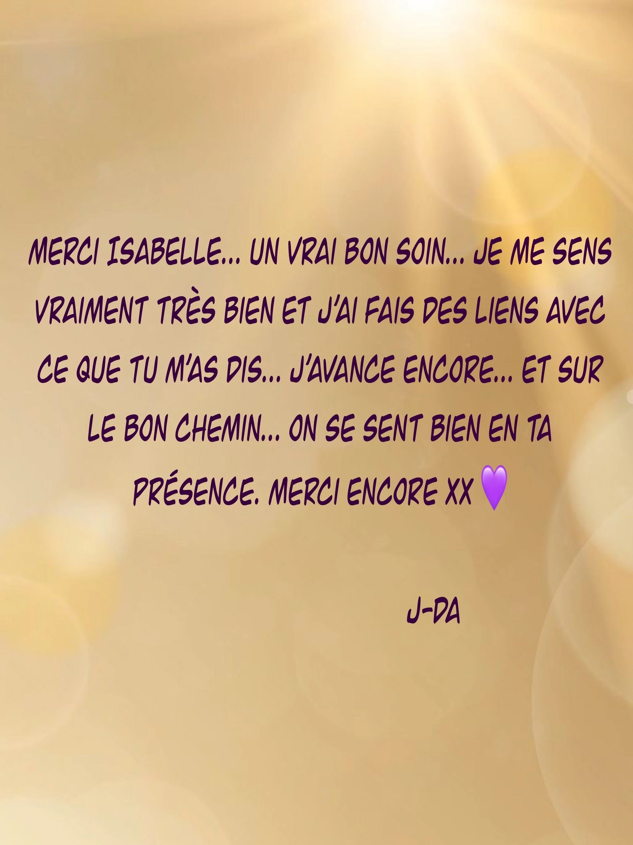 Puis j’entame une formation de thérapeute en relation d’aide. Je me sens exactement à la bonne place. Toute ma recherche de bien-être personnel et ses années d’écoute de l’autre, ont créer une base que je solidifie, en plus d’acquérir de nouveaux apprentissages passionnants. Durant ma formation nous abordons différentes approches, dont le fabuleux outil qu’est, l’hypnose humaniste. Ma soif de me pousse à poursuivre mes études dans ce domaine, avec une spécialisation en psychogénéalogie. Un monde de possibilité s’ouvre!
